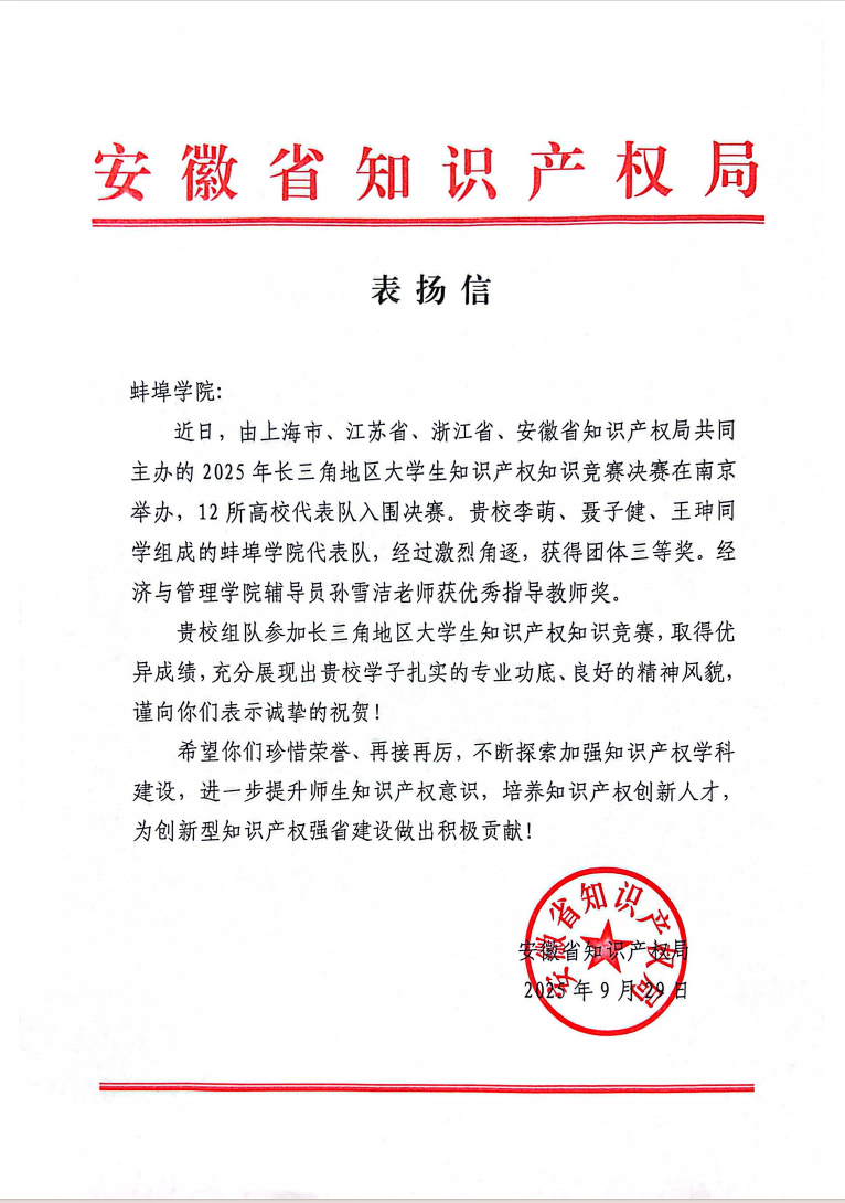 赛后,安徽省知识产权局向bat365官网发来表扬信,高度肯定bat365官网学子展现的扎实专业功底与良好精神风貌,并致以诚挚的祝贺!