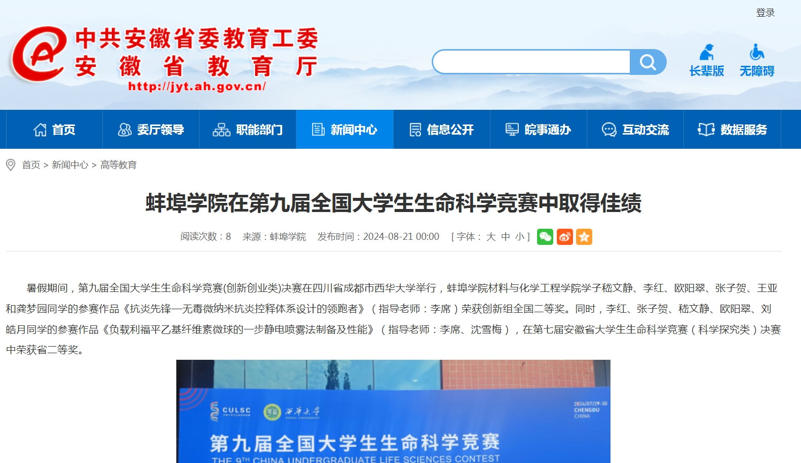 【安徽省教育厅】bat365在线中国官网登录入口在第九届全国大学生生命科学竞赛中取得佳绩