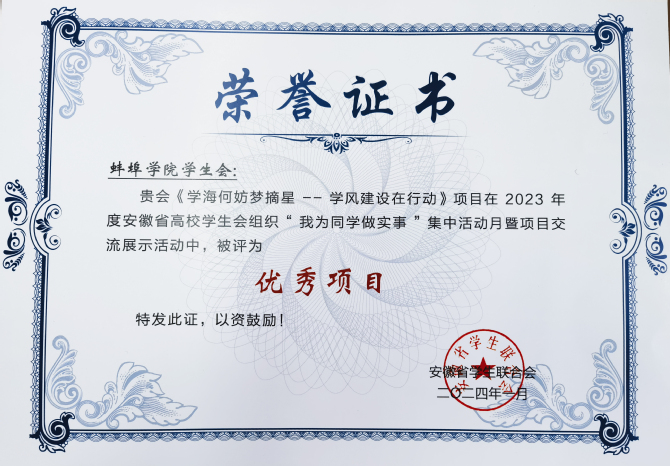 深化学生会改革,服务同学显担当:在党委领导、团委指导下,严格按照《学联学生会组织改革方案》要求,抓好学生会组织建设。坚持为同学做实事的工作宗旨,创建“学海摘星”学业促进类活动品牌,获评2023年度安徽省高校学生会组织“我为同学做实事”优秀品牌项目。