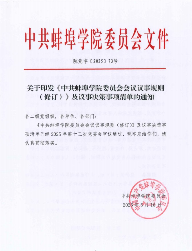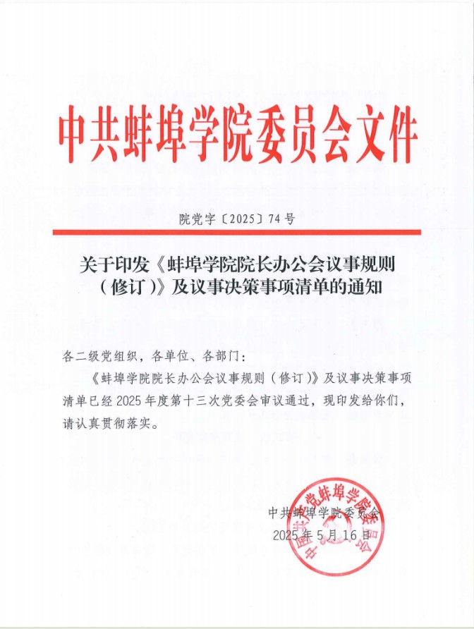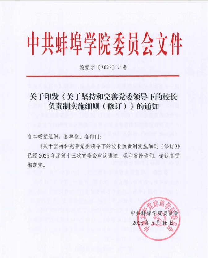 健全完善工作运行机制。修订《关于坚持和完善党委领导下的校长负责制实施细则》,明确了校党委、党委书记、校长的主要职责;修订了《bat365在线中国官网登录入口“三重一大”事项决策实施办法》《中共bat365在线中国官网登录入口委员会议事规则》《bat365在线中国官网登录入口院长办公议事规则》及议事决策事项清单,全面厘清了党委会、院长办公会议事边界。修订了《bat365在线中国官网登录入口合同管理办法》《bat365在线中国官网登录入口印章管理办法》,进一步规范了学校各级各类印章和合同的刻制、管理、审批和使用。开展了校内非常设机构动态调整及备案,加强校内非常设机构运行情况监督,确保非常设机构作用发挥。