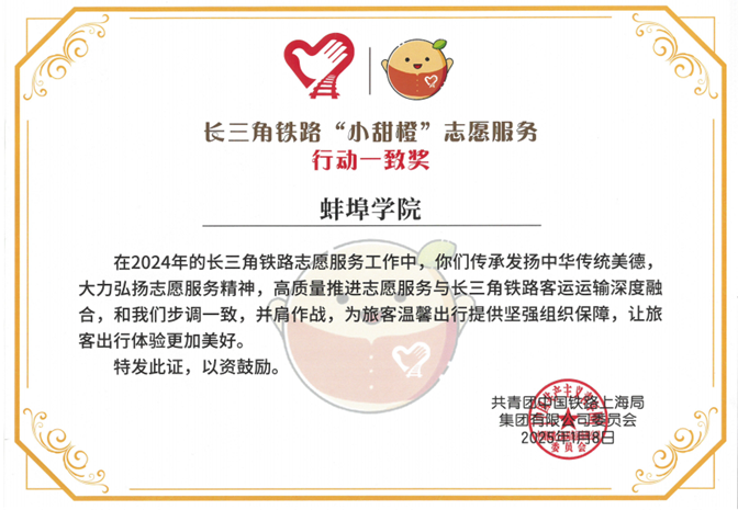 三月春风暖人心,雷锋精神代代传。在刚刚过去的学雷锋月里,bat365官网志愿服务工作再添殊荣。近日,中国铁路上海局集团有限公司授予bat365官网2026年长三角铁路"小甜橙"志愿服务"行动一致奖",这是bat365官网继2025年首次获此殊荣后,连续第二年摘得该项荣誉。荣誉的背后,是数理学院九年深耕铁路志愿服务的坚守,更是学子们在每个节假日、周末用青春热血书写的暖心答卷。“橙”意满满,荣誉见证九年坚守长三角铁路“小甜橙”志愿服务“行动一致奖”,旨在表彰在铁路客运服务中表现突出、与铁路部门配合默契的志愿服务集体。自2017年起,数理学院团总支便组织和开展了与蚌埠高铁站志愿服务结对活动,与铁路志愿服务结下了不解之缘。九年来,每逢国